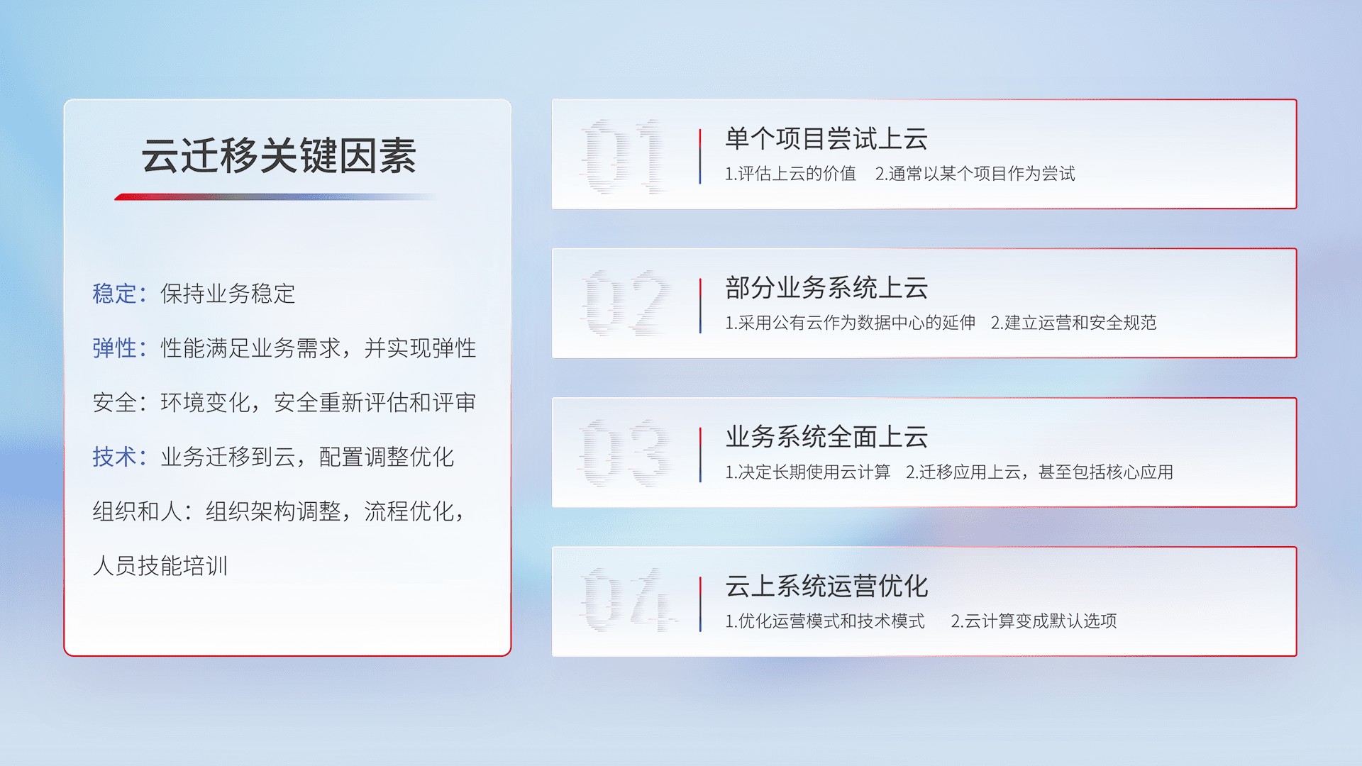 结合实际业务,,,,从规划设计、、云平台选型、、、云原生改造、、、数据迁移、、、集成交付,,迁移全过程为客户识别最佳上云路径,,,做好风险识别管理,,设计网络架构、、、、身份权限、、、、安全审计合规、、操作审计、、、、日志审计、、、、监控告警策略、、、、多站点容灾设计等,,对云上基础设施进行整体规划,,,,提升IT治理水平,,,以满足弹性、、、、高可用、、、高性能的需求。。