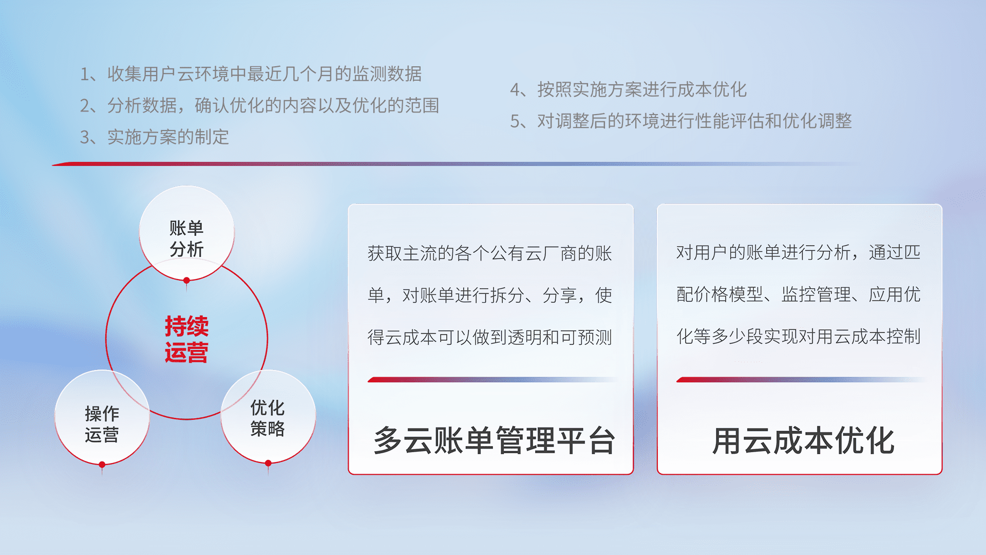 通过多云纳管,,以统一的资源数据模型把客户的云资源进行抽象和封装,,进而实现对多云资源的统一操作,,保障云资源管理的可靠性、、稳定性与可用性。。量身定制化运维内容,,配置、、、、开发运维、、、、补丁管理、、、备份、、监控、、、、认证和访问管理、、审计和日常巡检等,,,保障在用云过程中的可靠度,,稳定度以及高可用率。。。。